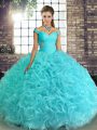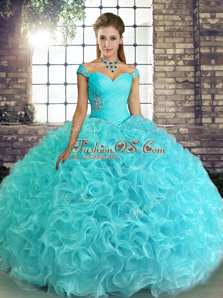 Aqua Blue Ball Gowns Fabric With Rolling Flowers Off The Shoulder Sleeveless Beading Floor Length Lace Up Quince Ball Gowns