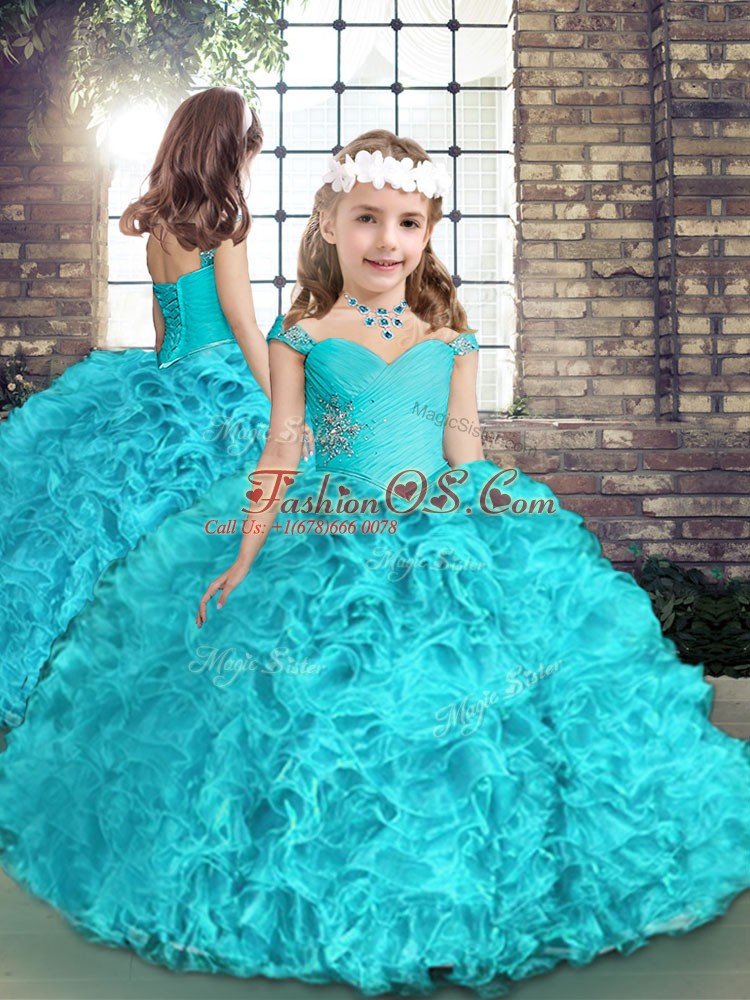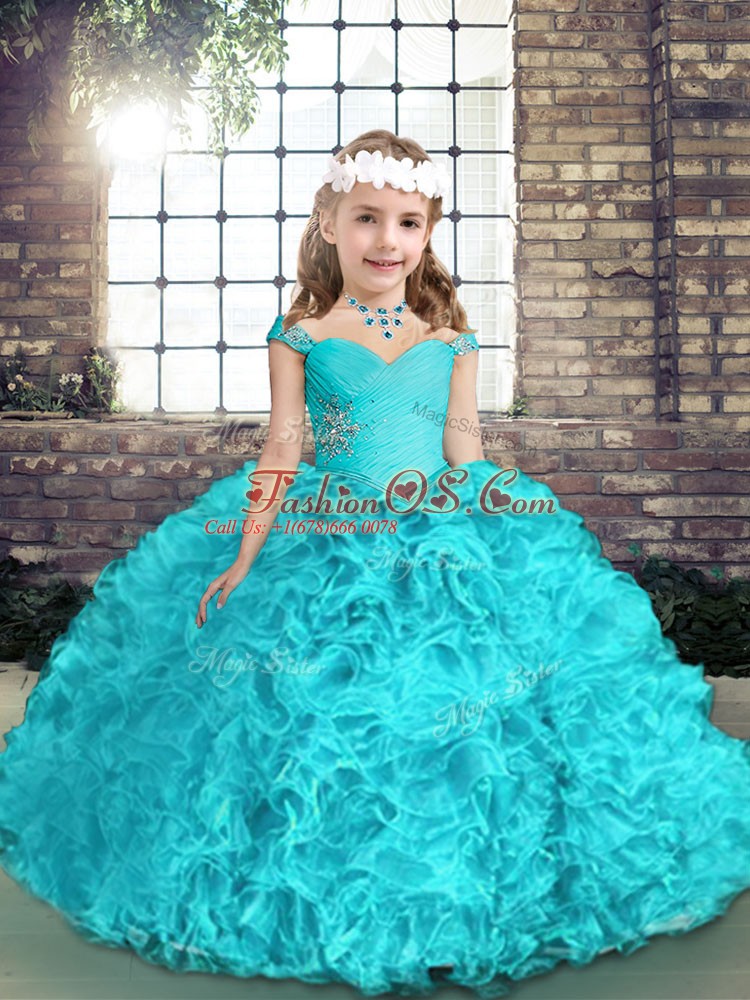 Home >  Special Occasion Dresses >  Pretty Little Girl Pageant Dresses > Aqua Blue Ball Gowns Organza Straps Sleeveless Beading Floor Length Lace Up Little Girl Pageant Gowns