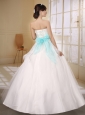 Home >  Wedding Dresses >  Ball Gown Wedding Dresses > Aqua Blue Bow Sash Decorate On Waist Custom Made Strapless Neckline Ball Gown Organza Wedding Dress