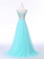 Aqua Blue Chiffon Backless Scoop Sleeveless Evening Dresses Brush Train Lace and Appliques