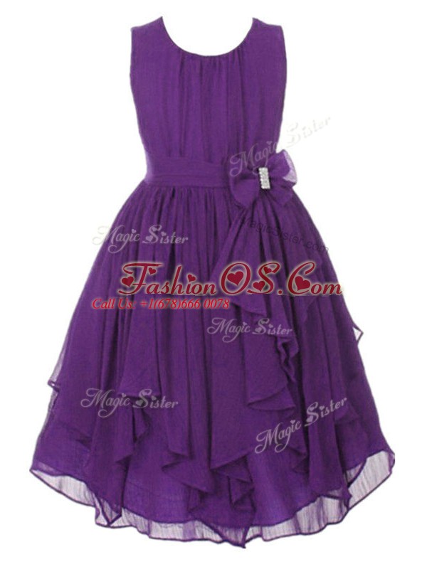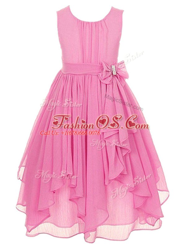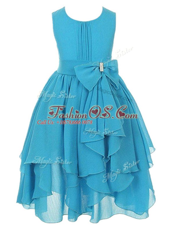 Aqua Blue Chiffon Zipper Scoop Sleeveless Asymmetrical Kids Pageant Dress Ruffles and Bowknot