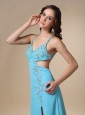 Aqua Blue Column Spaghetti Straps Brush Train Chiffon and Elastic Woven Satin Beading Prom Dress