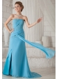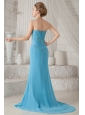 Aqua Blue Column Strapless Brush Train Chiffon Beading and Ruch Prom / Celebrity Dress