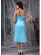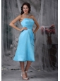 Make an entrance in this elegant and romantic prom dress. This aqua blue dress features a strapless bodice and a column tea-length skirt. The midsection of the gown is cinched by a gorgeous delicate ruched belt that perfectly complements the bands on the right side of the waist. The hidden zipper up back hold the dress in place.