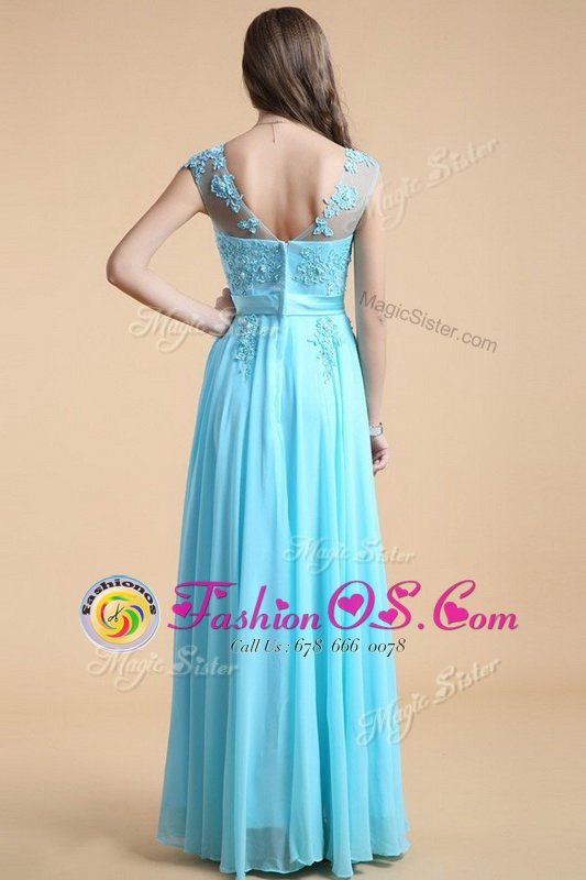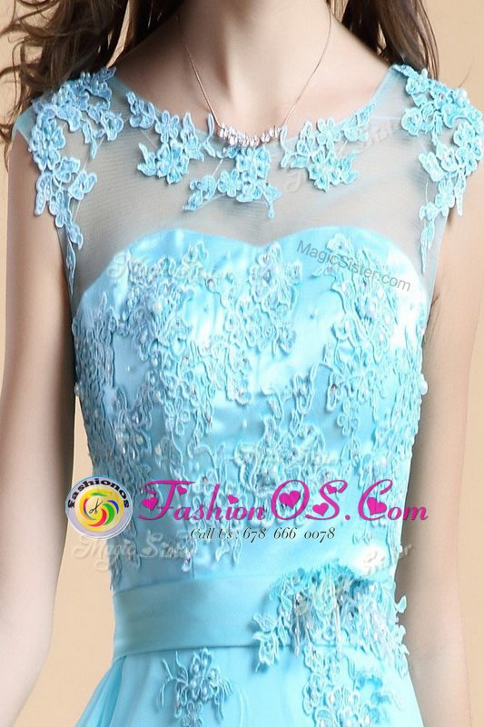 Aqua Blue Column/Sheath Chiffon Scoop Sleeveless Appliques Floor Length Zipper Homecoming Party Dress