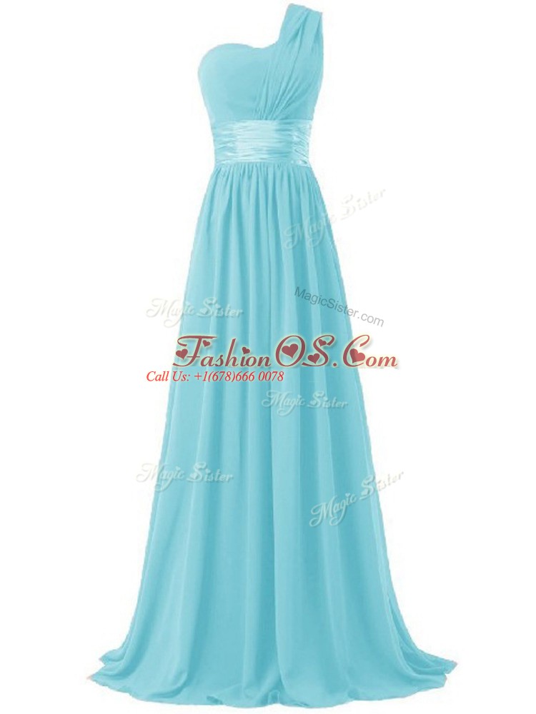 Aqua Blue Empire One Shoulder Sleeveless Chiffon Floor Length Lace Up Ruching Dama Dress