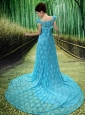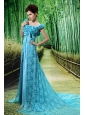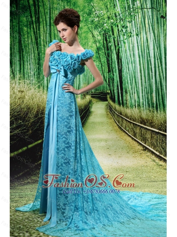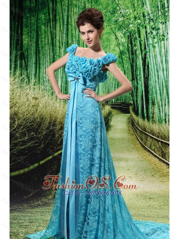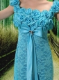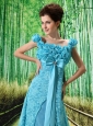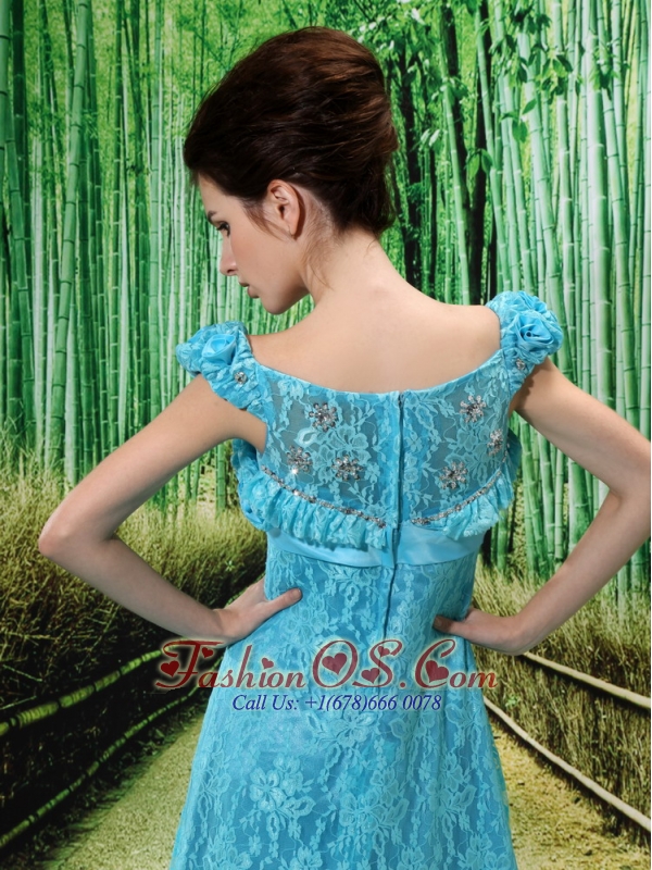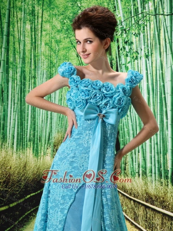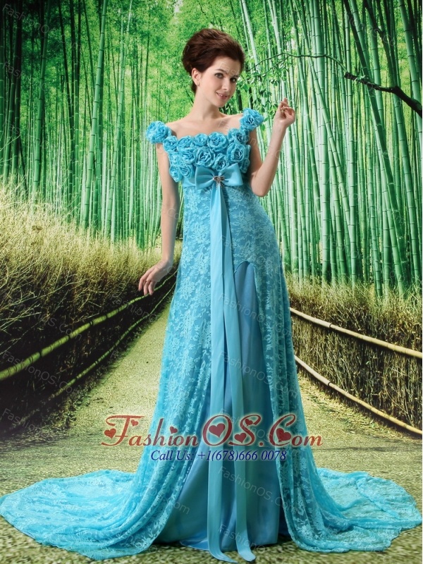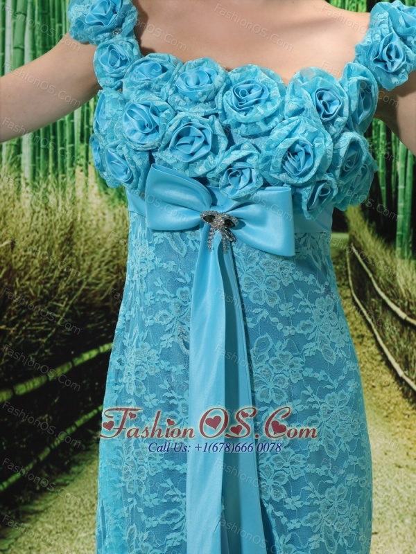 Home >  Special Occasion Dresses >  Mother of the Bride Dresses > Aqua Blue Flowers Decorate Mother of the Bride Dress With Lace Sequare Neckline