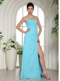 If you're looking for a chic and elegant design for your next event, look no further. This aqua blue prom dress will definitely suffice. It features a gorgeous strapless bodice with a modest sweetheart with stunning beads deocrate. The peated bodice show off your feminine figure. The skirt with a high slit is fitted and it falls in soft lines to the floor, creating a lovely silhouette. Just a very flattering design for any body shape or style.