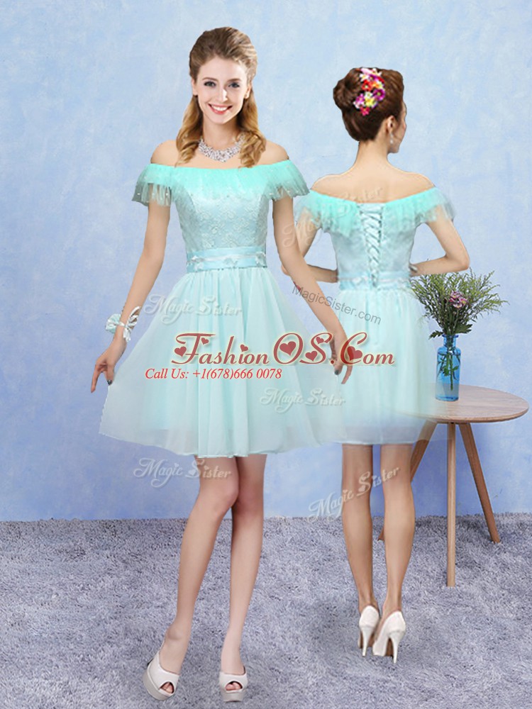Aqua Blue Lace Up Off The Shoulder Lace Quinceanera Court of Honor Dress Tulle Cap Sleeves