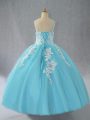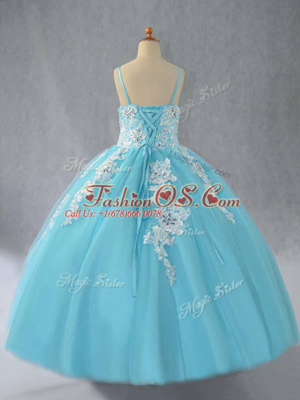 Aqua Blue Lace Up Spaghetti Straps Beading and Appliques Kids Pageant Dress Tulle Sleeveless