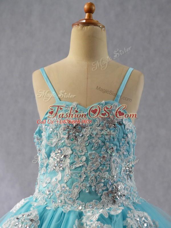 Home >  Special Occasion Dresses >  Pretty Little Girl Pageant Dresses > Aqua Blue Lace Up Spaghetti Straps Beading and Appliques Kids Pageant Dress Tulle Sleeveless