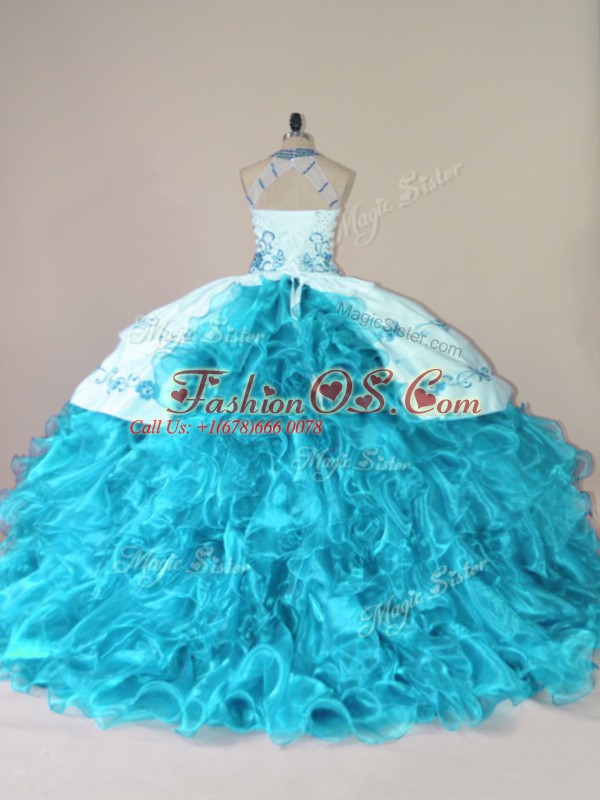 Aqua Blue Quinceanera Dress Sweet 16 and Quinceanera with Embroidery and Ruffles Halter Top Sleeveless Court Train Lace Up