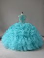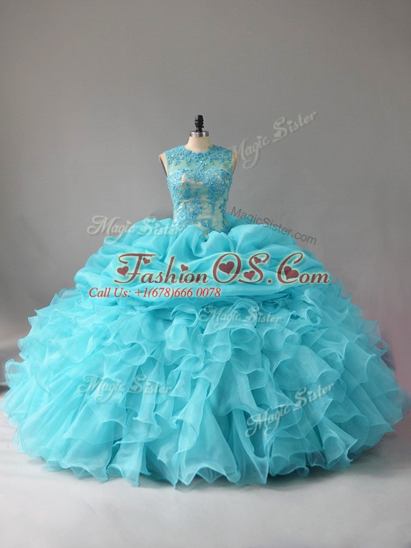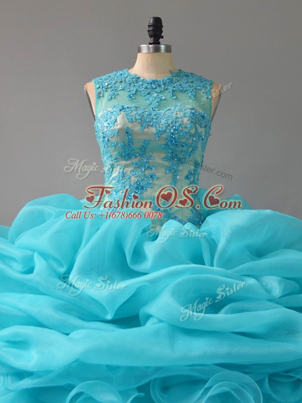 Aqua Blue Scoop Zipper Appliques and Ruffles and Pick Ups Sweet 16 Dress Sleeveless