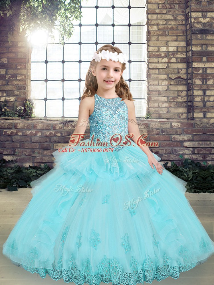 Home >  Special Occasion Dresses >  2018 Little Girl Pageant Dresses > Aqua Blue Sleeveless Floor Length Beading and Lace and Appliques Lace Up Kids Formal Wear