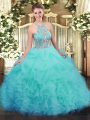 Aqua Blue Sleeveless Tulle Lace Up Sweet 16 Dresses for Military Ball and Sweet 16 and Quinceanera