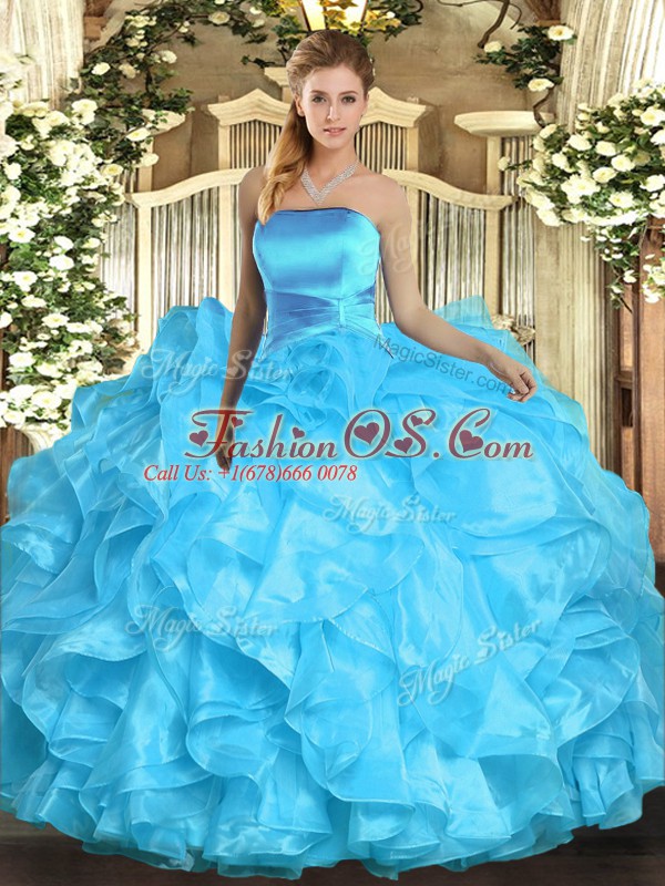 Aqua Blue Strapless Neckline Ruffles 15 Quinceanera Dress Sleeveless Lace Up