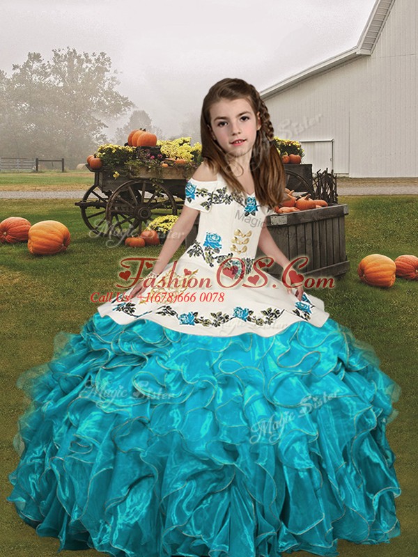 Aqua Blue Straps Neckline Embroidery and Ruffles Little Girl Pageant Gowns Sleeveless Lace Up