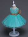 Home >  Special Occasion Dresses >  Mini Quinceanera Dresses > Aqua Blue Tulle Zipper Scoop Sleeveless Knee Length Kids Formal Wear Lace and Bowknot