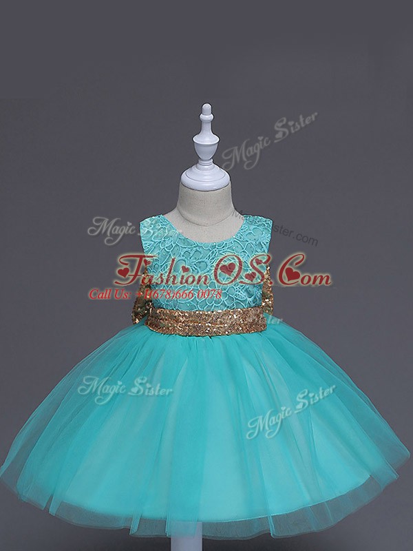 Aqua Blue Tulle Zipper Scoop Sleeveless Knee Length Kids Formal Wear Lace and Bowknot