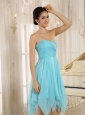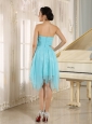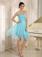 Simple but gorgeous aqua prom dress is. It features a strapless bodice with a sweetheart neckline and heavily embellished beadings in the left bust side area that highlight your natural waist. The short skirt flows freely in handkerchief style and a zipper up closure completes this gorgeous design. You will surely be the outstanding star in the prom.