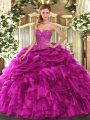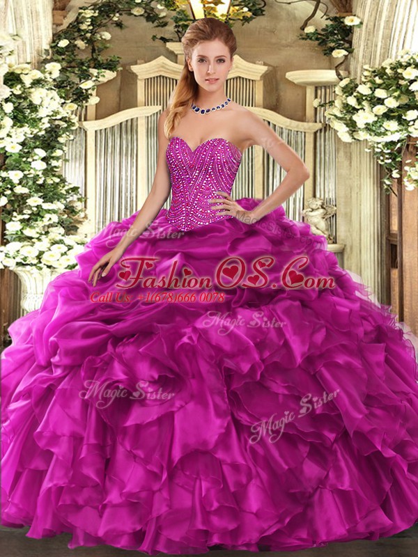 Artistic Fuchsia Ball Gowns Beading and Ruffles and Pick Ups Sweet 16 Dresses Lace Up Organza Sleeveless Floor Length
