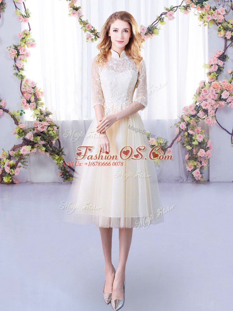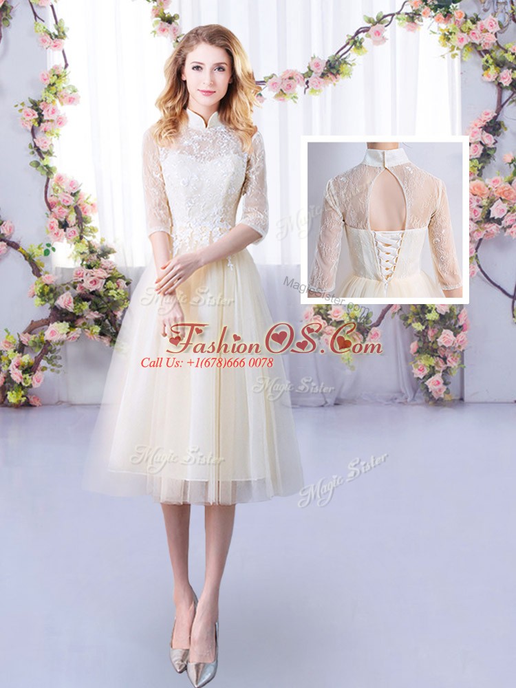 Artistic Half Sleeves Tulle Tea Length Lace Up Wedding Party Dress in Champagne with Lace