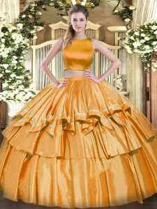 Artistic High-neck Sleeveless Sweet 16 Dresses Floor Length Ruffled Layers Orange Tulle