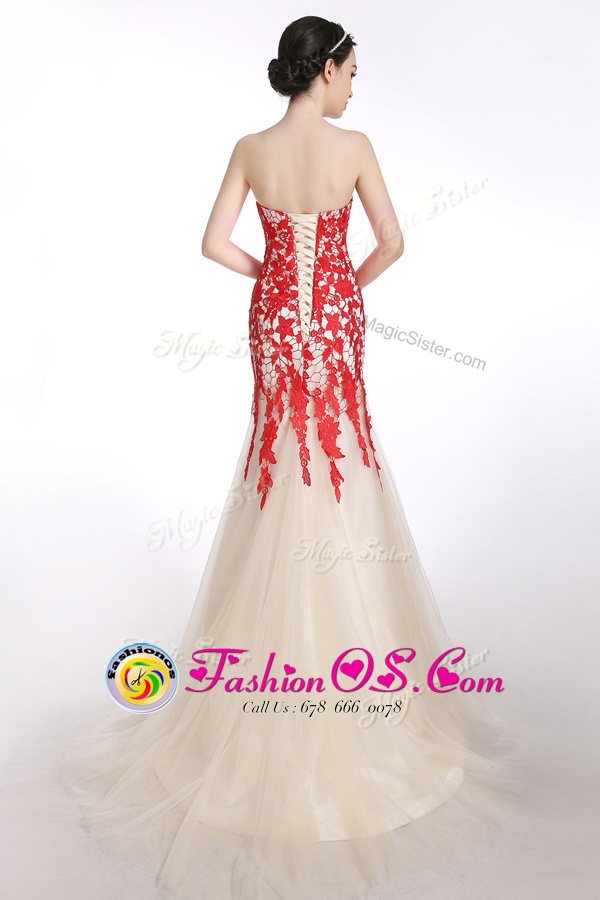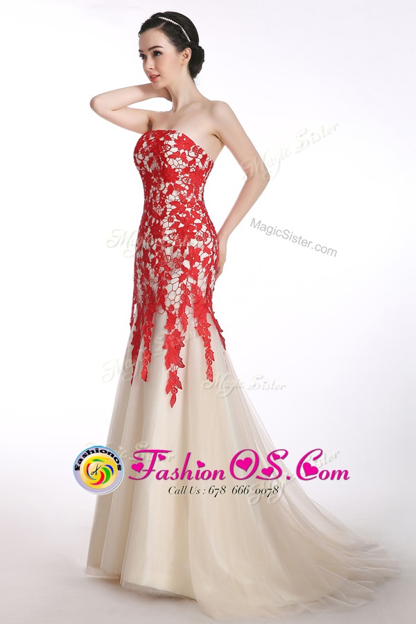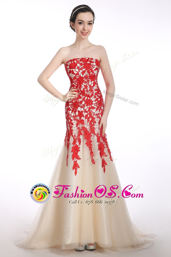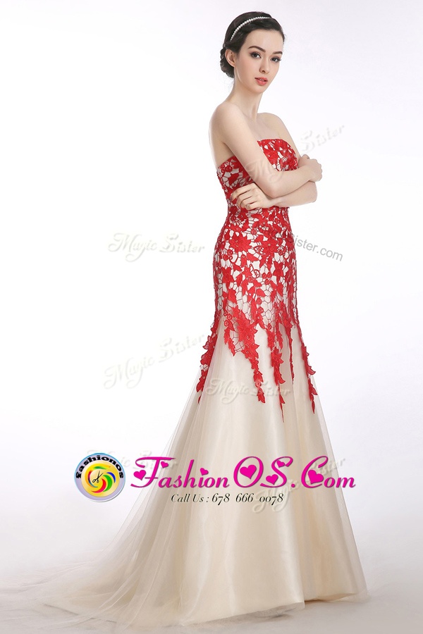 Artistic Mermaid Strapless Sleeveless Prom Dresses Brush Train Appliques Red and Champagne Tulle