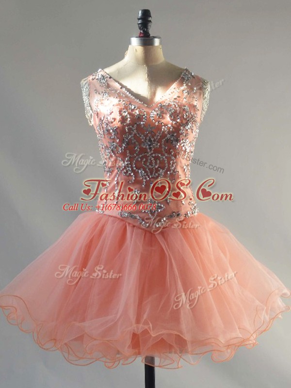 Artistic Peach Sleeveless Mini Length Beading Lace Up Prom Dress