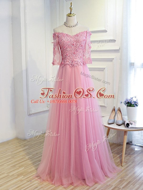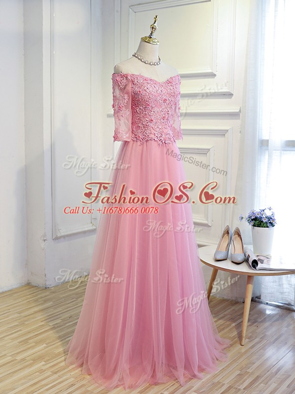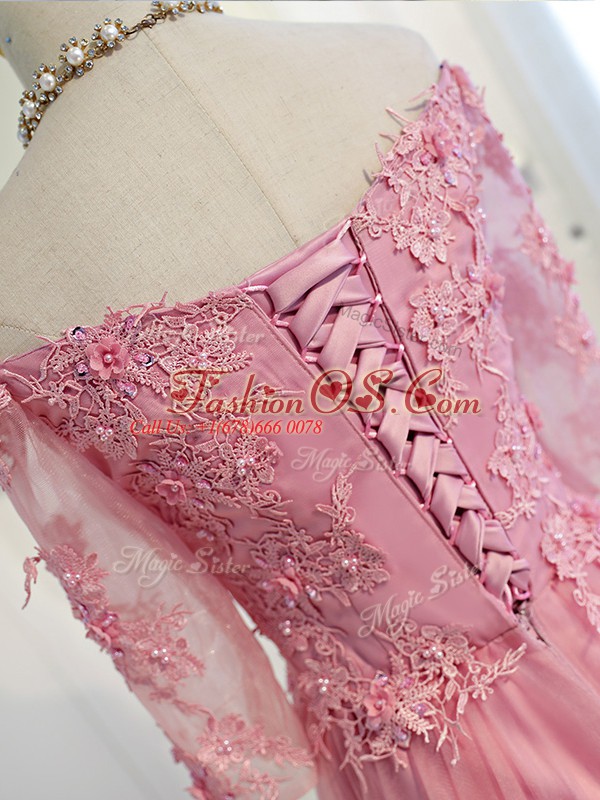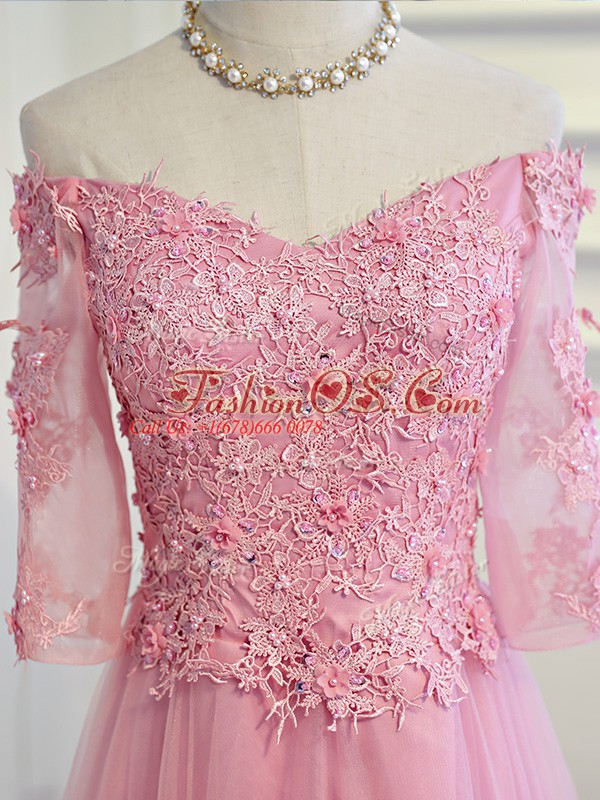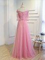 Artistic Pink A-line Off The Shoulder 3 4 Length Sleeve Tulle Floor Length Lace Up Beading and Lace and Appliques Mother Of The Bride Dress