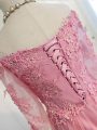 Home >  Special Occasion Dresses >  Elegant Mother of the Bride Dresses > Artistic Pink A-line Off The Shoulder 3 4 Length Sleeve Tulle Floor Length Lace Up Beading and Lace and Appliques Mother Of The Bride Dress