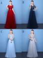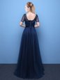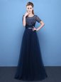 Artistic Scoop Beading Dress for Prom Navy Blue Lace Up Short Sleeves Floor Length