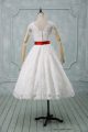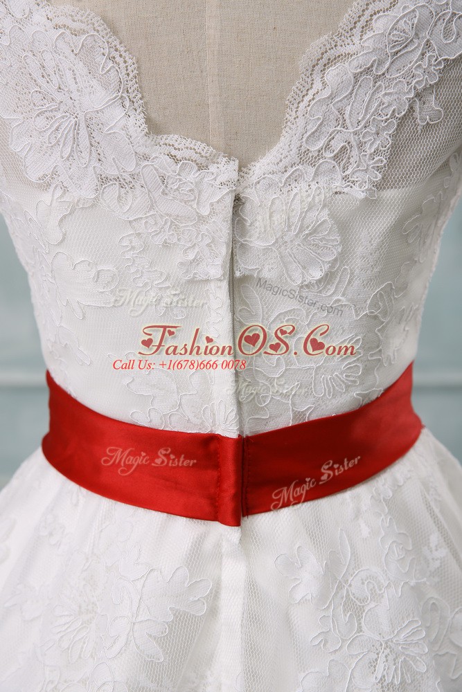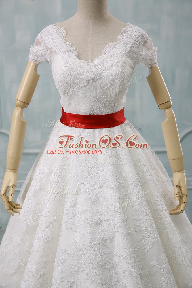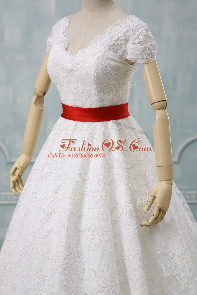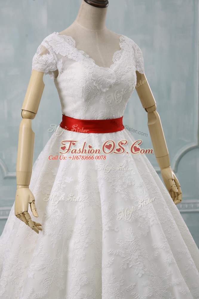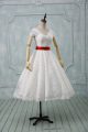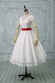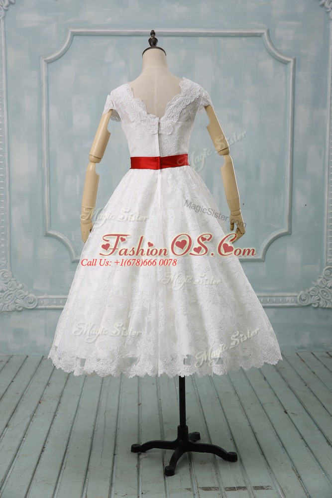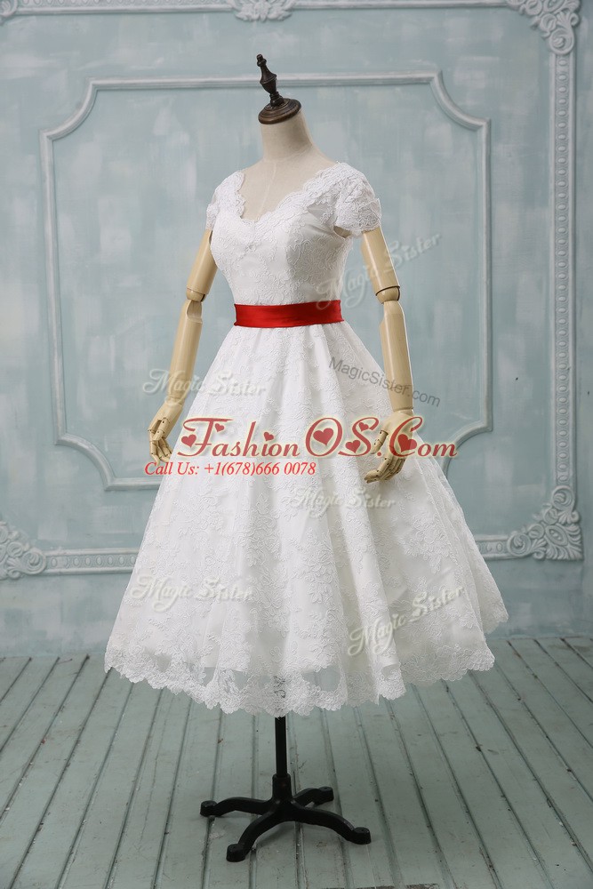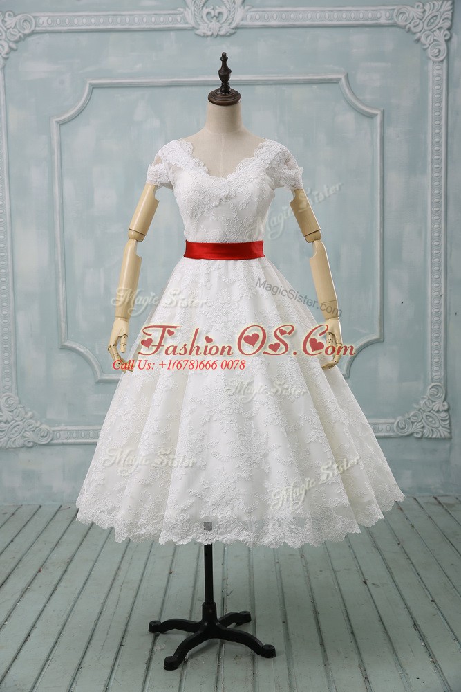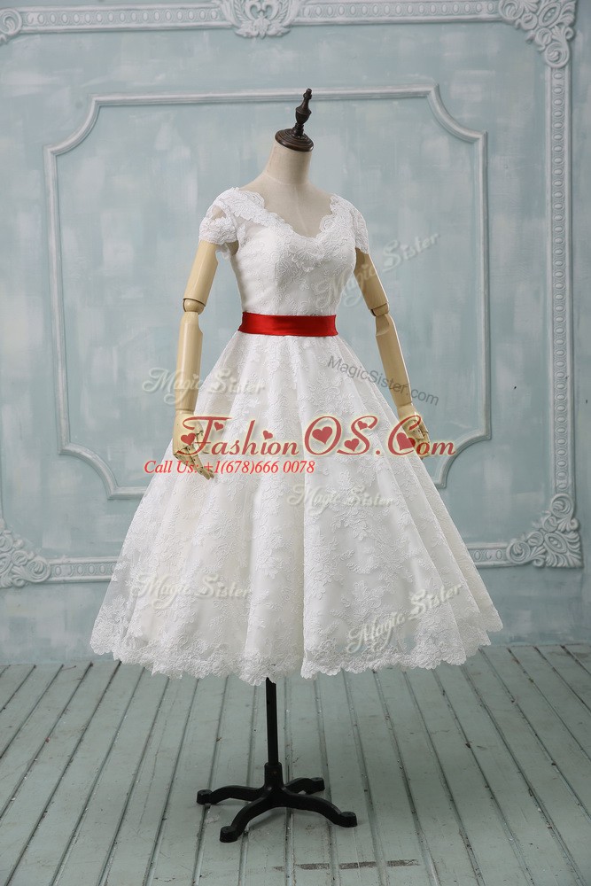 Artistic Short Sleeves Tea Length Lace and Belt Zipper Wedding Dresses with White
