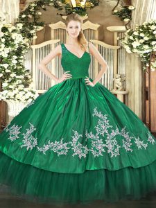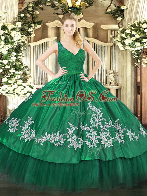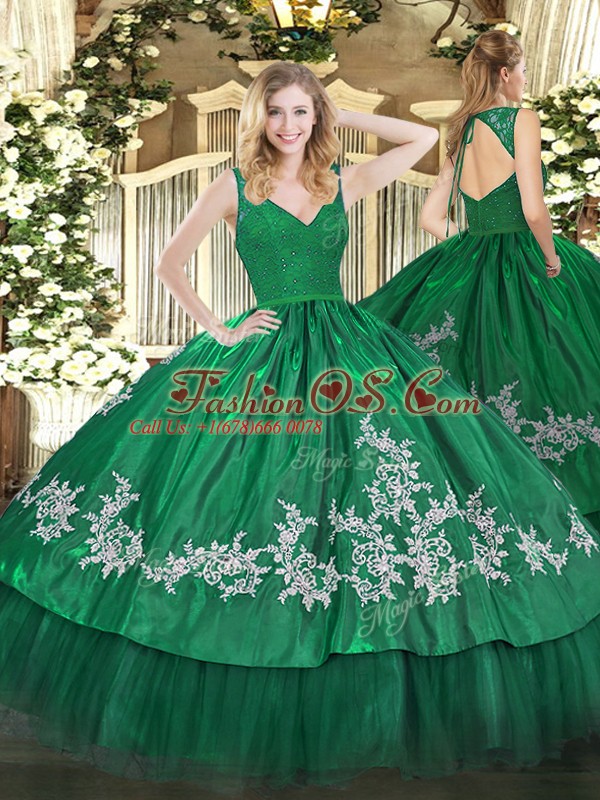 Artistic Sleeveless Taffeta Floor Length Zipper 15th Birthday Dress in Dark Green with Beading and Appliques