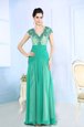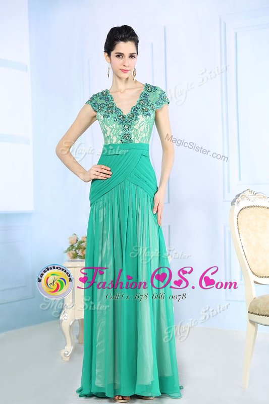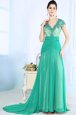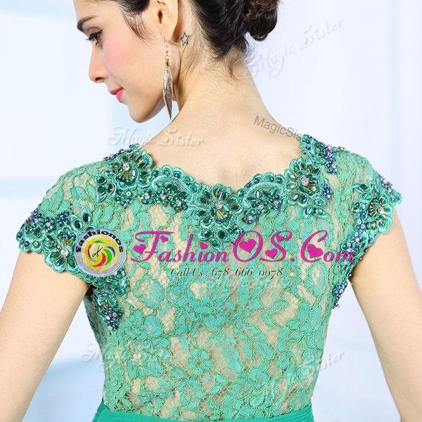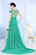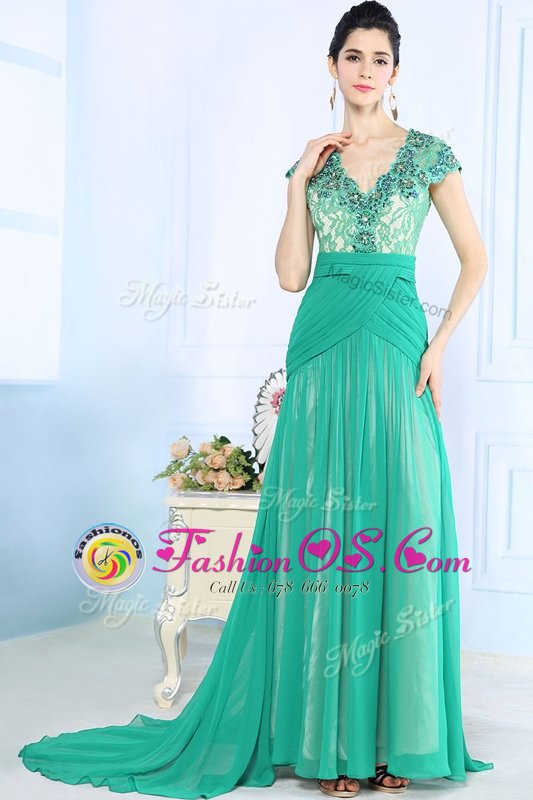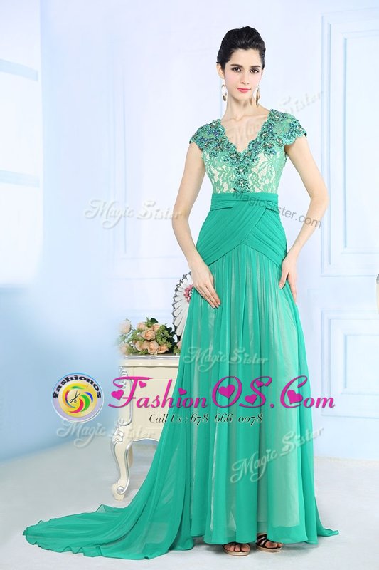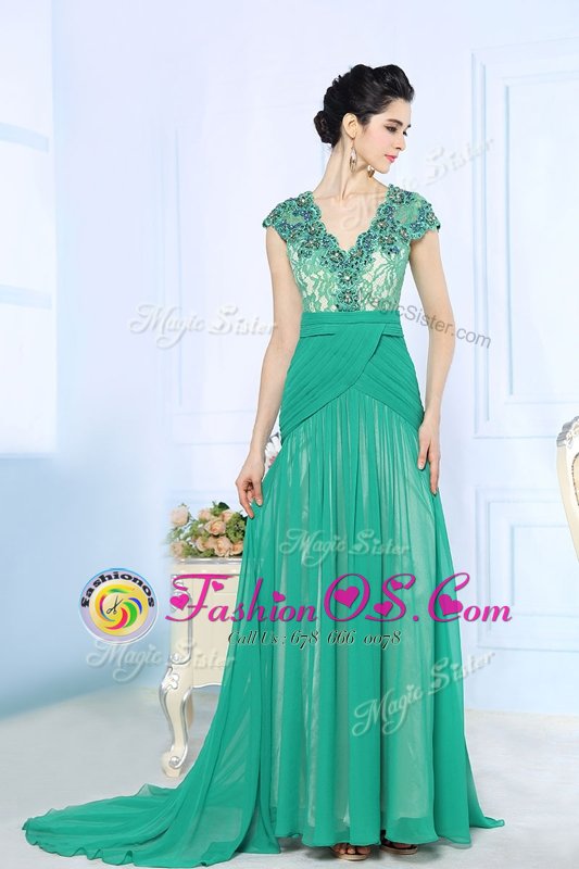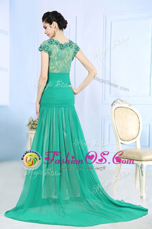 Artistic Turquoise Column/Sheath Beading and Lace and Ruching Red Carpet Gowns Side Zipper Chiffon Cap Sleeves With Train
