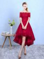 Artistic Wine Red Lace Up Bridesmaid Gown Appliques Short Sleeves High Low