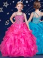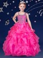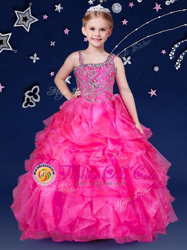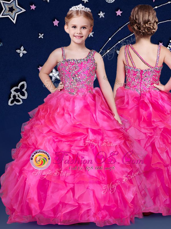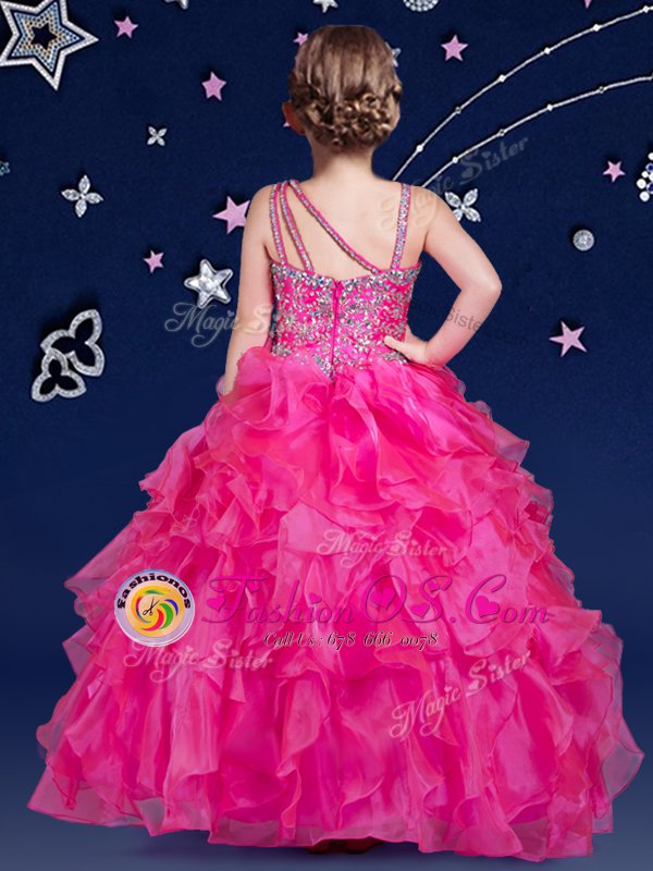 Home >  Special Occasion Dresses >  Mini Quinceanera Dresses > Asymmetric Sleeveless Flower Girl Dresses Floor Length Beading and Ruffles Hot Pink Organza