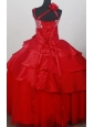 Multi tiered full skirt and beaded bodice red one shoulder dress makes you a super star this year. Fitted drop waist bodice with a flower for decoration. Customize to your own special requirements.