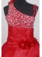 Asymmetrical Red Beaded and Flowers Decorate Flower Girl Dress