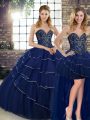 Attractive Brush Train Three Pieces Sweet 16 Dresses Navy Blue Sweetheart Tulle Sleeveless Lace Up