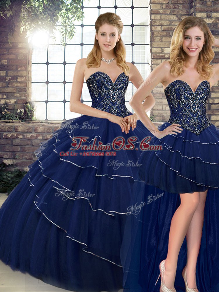 Home >  Quinceanera Dresses >  Detachable Quinceanera Skirts > Attractive Brush Train Three Pieces Sweet 16 Dresses Navy Blue Sweetheart Tulle Sleeveless Lace Up