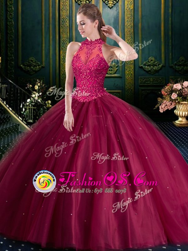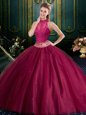 Attractive Burgundy Sleeveless Tulle Lace Up Quince Ball Gowns for Military Ball and Sweet 16 and Quinceanera