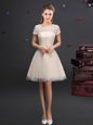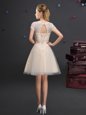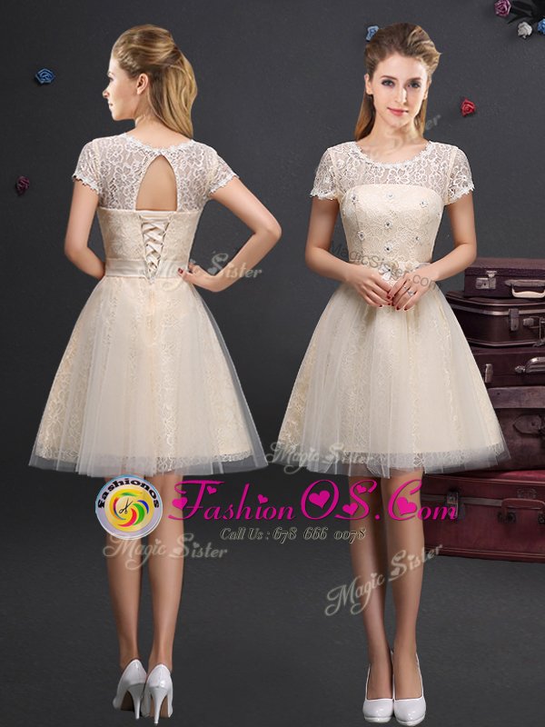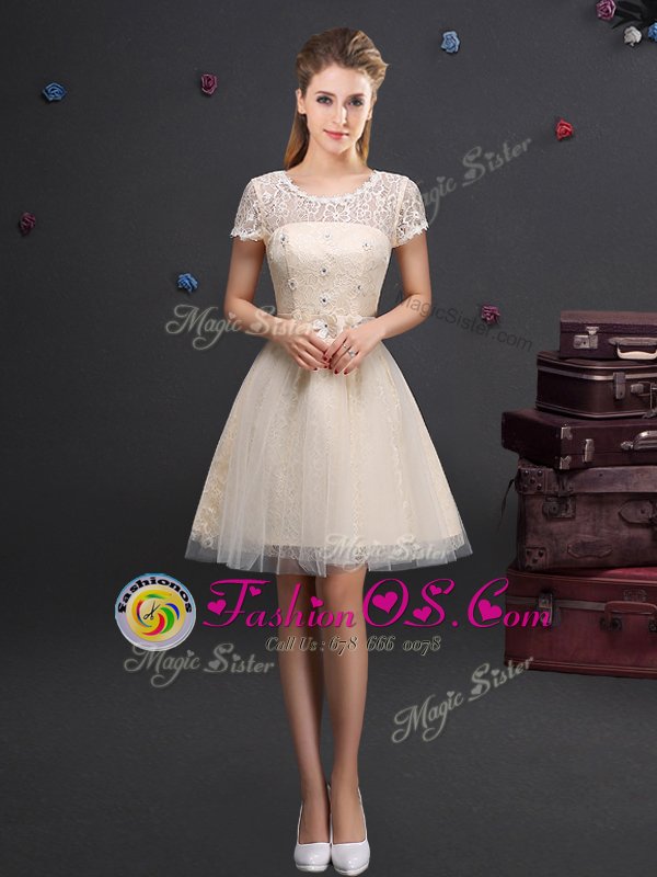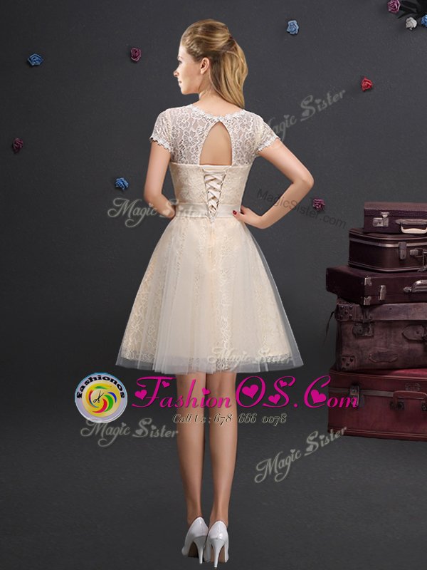 Attractive Champagne Scoop Lace Up Lace and Appliques and Belt Wedding Guest Dresses Short Sleeves