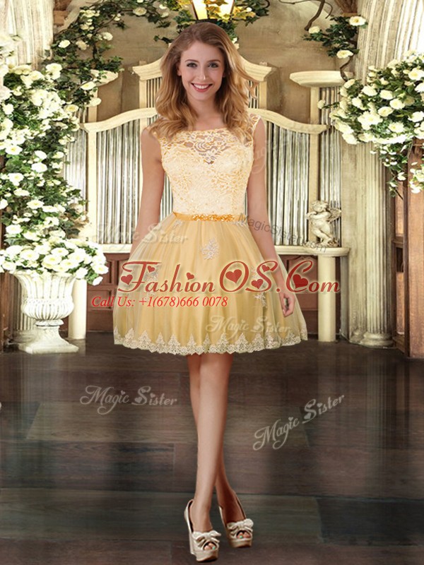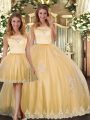 Attractive Gold Three Pieces Scoop Sleeveless Tulle Floor Length Clasp Handle Lace and Appliques Sweet 16 Quinceanera Dress