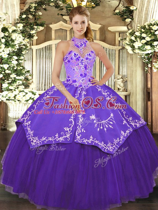 Attractive Halter Top Sleeveless Quinceanera Gowns Floor Length Beading and Embroidery Purple Satin and Tulle