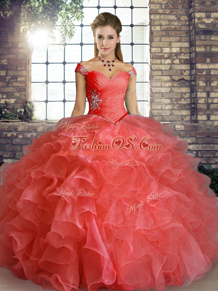 Attractive Organza Off The Shoulder Sleeveless Lace Up Beading and Ruffles Sweet 16 Dress in Watermelon Red