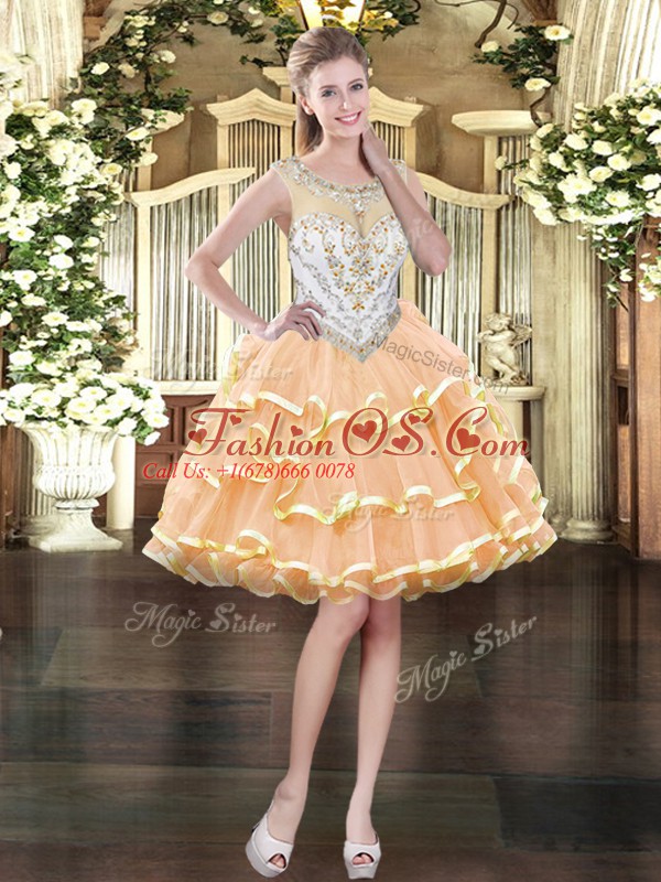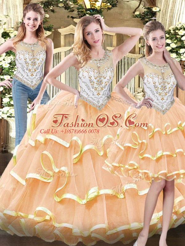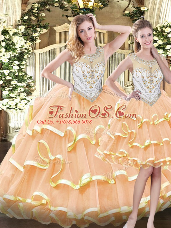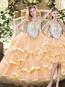 Attractive Peach Ball Gown Prom Dress Military Ball and Sweet 16 and Quinceanera with Beading and Ruffled Layers Scoop Sleeveless Zipper