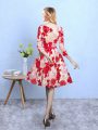 Attractive Printed Scoop 3 4 Length Sleeve Lace Up Pattern Vestidos de Damas in Red