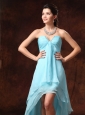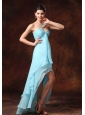 Looking for a prom dress with a chic design that will make it easy to move and dance yet still look sexy and glamorous? Well here it is! This elegant strapless dress for prom is fabulous. A auqa blue skirt with a contrasting beaded V-neckline, the dress show off its unique design. Slight ruching details througthout the bust area to create a perfect effect. A high-low skirt drops from the under bust to the back in a nature loose. Layers of soft sheer chiffon makes the dress flowy and airly.