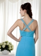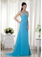 Baby Blue Column V-neck Prom / Celebrity Dress Brush Train Chiffon Beading